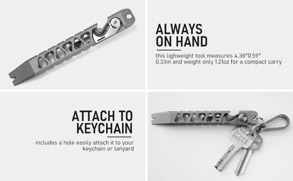 Crafted from durable TC4 titanium alloy, this EDC pry bar combines strength and lightweight portability. It serves as a pry bar, bottle opener, screwdriver, and nail driver, perfect for daily tasks or outdoor activities. With an integrated pocket clip and ergonomic design for a secure grip, it’s easy to carry and deploy. Measuring 4.38″ x 0.59″, this slim tool is ideal for everyday carry, making it a great gift choice.