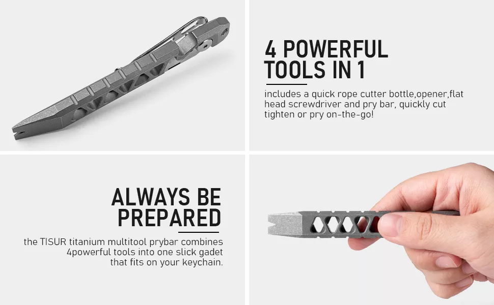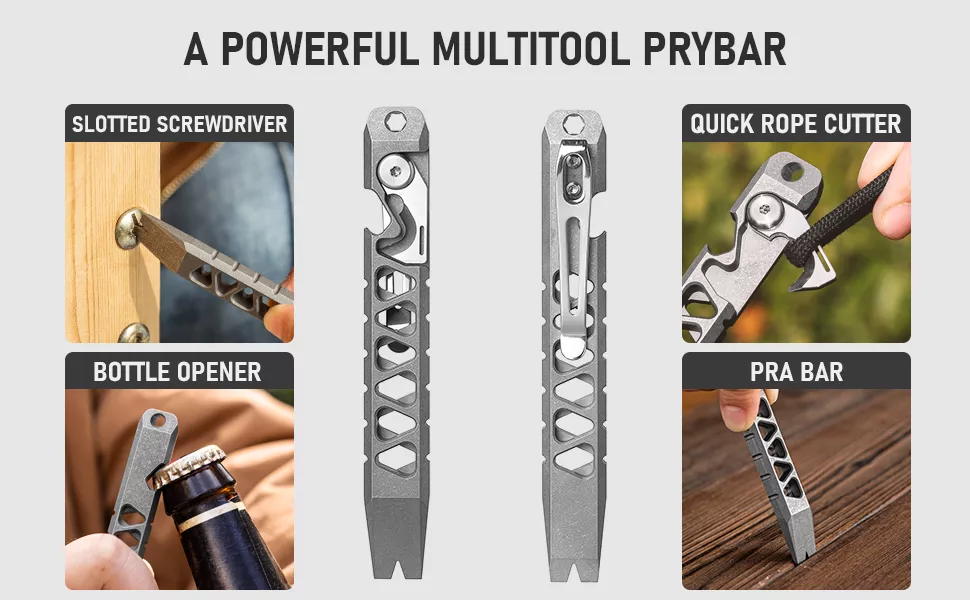Crafted from durable TC4 titanium alloy, this EDC pry bar combines strength and lightweight portability. It serves as a pry bar, bottle opener, screwdriver, and nail driver, perfect for daily tasks or outdoor activities. With an integrated pocket clip and ergonomic design for a secure grip, it’s easy to carry and deploy. Measuring 4.38″ x 0.59″, this slim tool is ideal for everyday carry, making it a great gift choice.